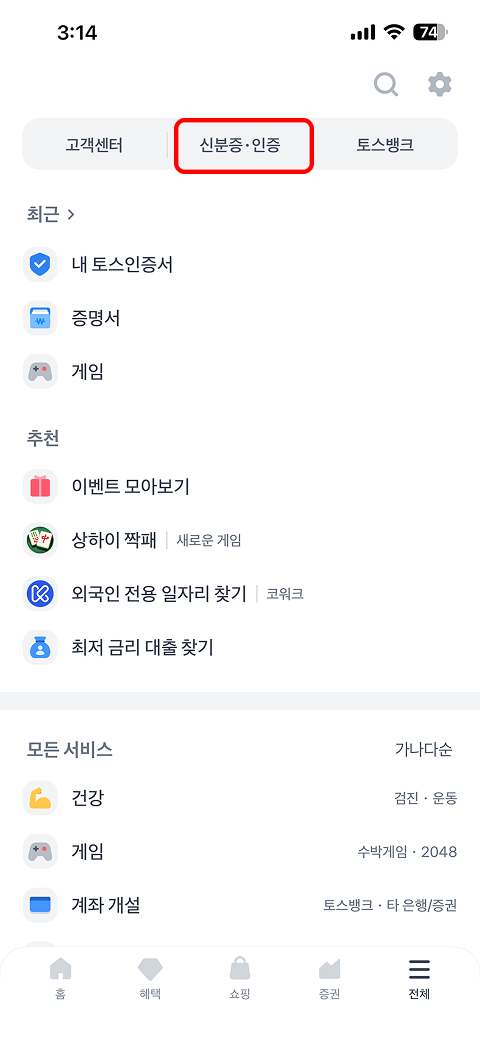토스앱 실행 후 하단 전체메뉴 에서 신분증·인증 → 토스 인증서를 눌러주세요