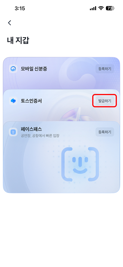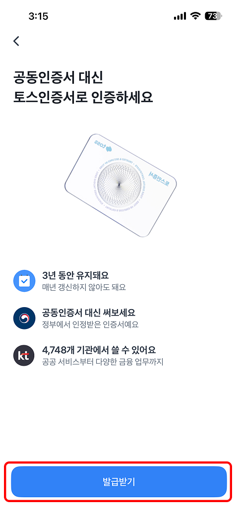 토스앱 실행 → 전체 → 신분증·인증 → 인증서 발급