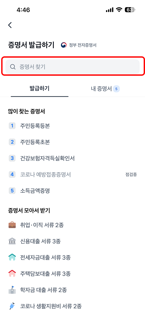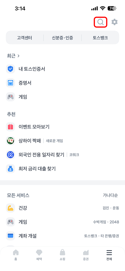 토스앱 실행 → (하단) 전체 → 검색(돋보기) 클릭 → 증명서발급하기 검색