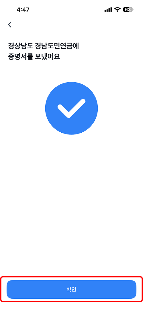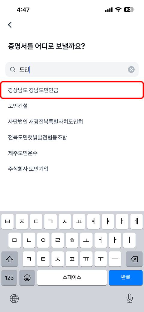 제출 기관 검색 → '경상남도 경남도민연금' 제출 기관 선택 → 다음 → 이용약관 전체동의 → 완료