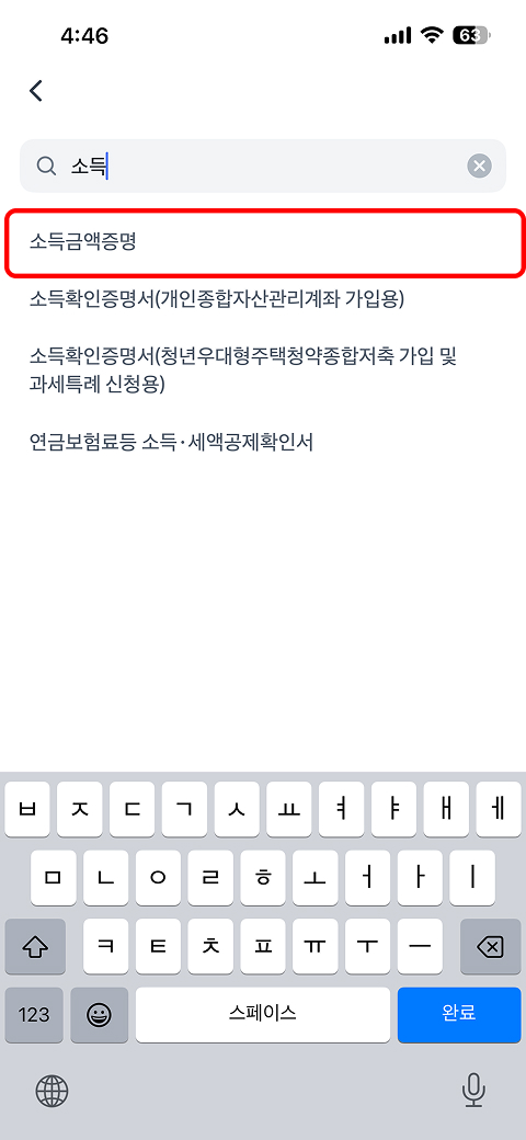 증명서 검색란 → 소득금액증명 검색 → 관공서 제출용