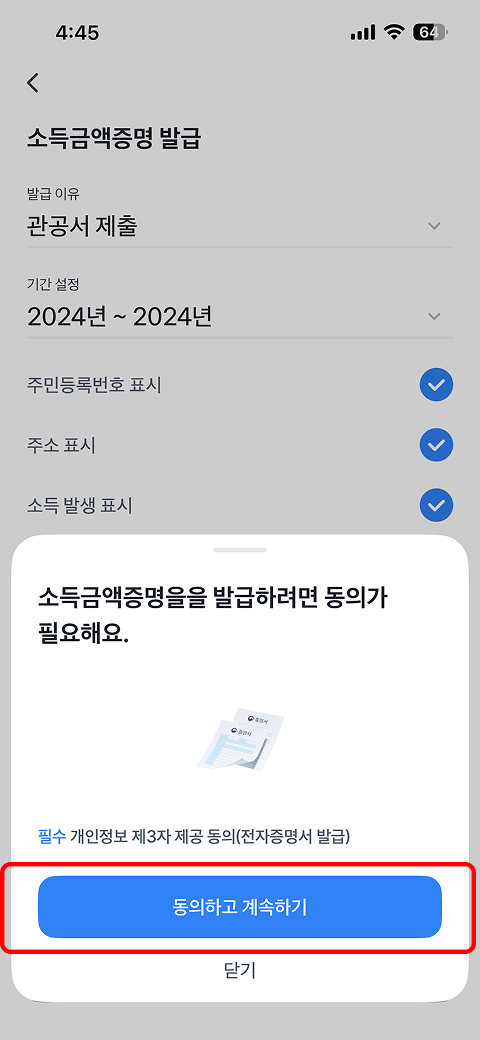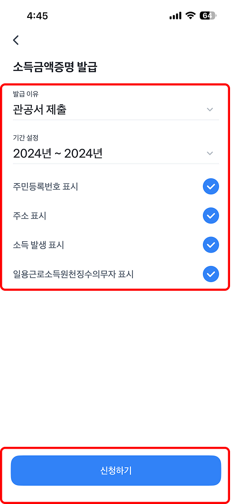 증명기간을 2024년~2024년으로 선택하고 발급내용을 모두 체크 후 [필수]제공동의 후 → 인증 후 신청하기